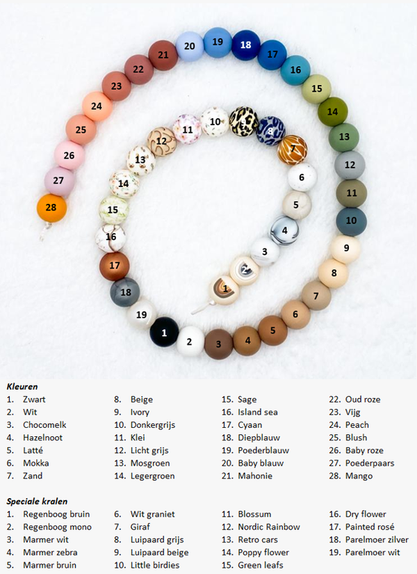 - De kralen zijn makkelijk af te doen met een billendoekjes/snoetenpoetsers. Uitkoken of steriliseren is niet mogelijk!